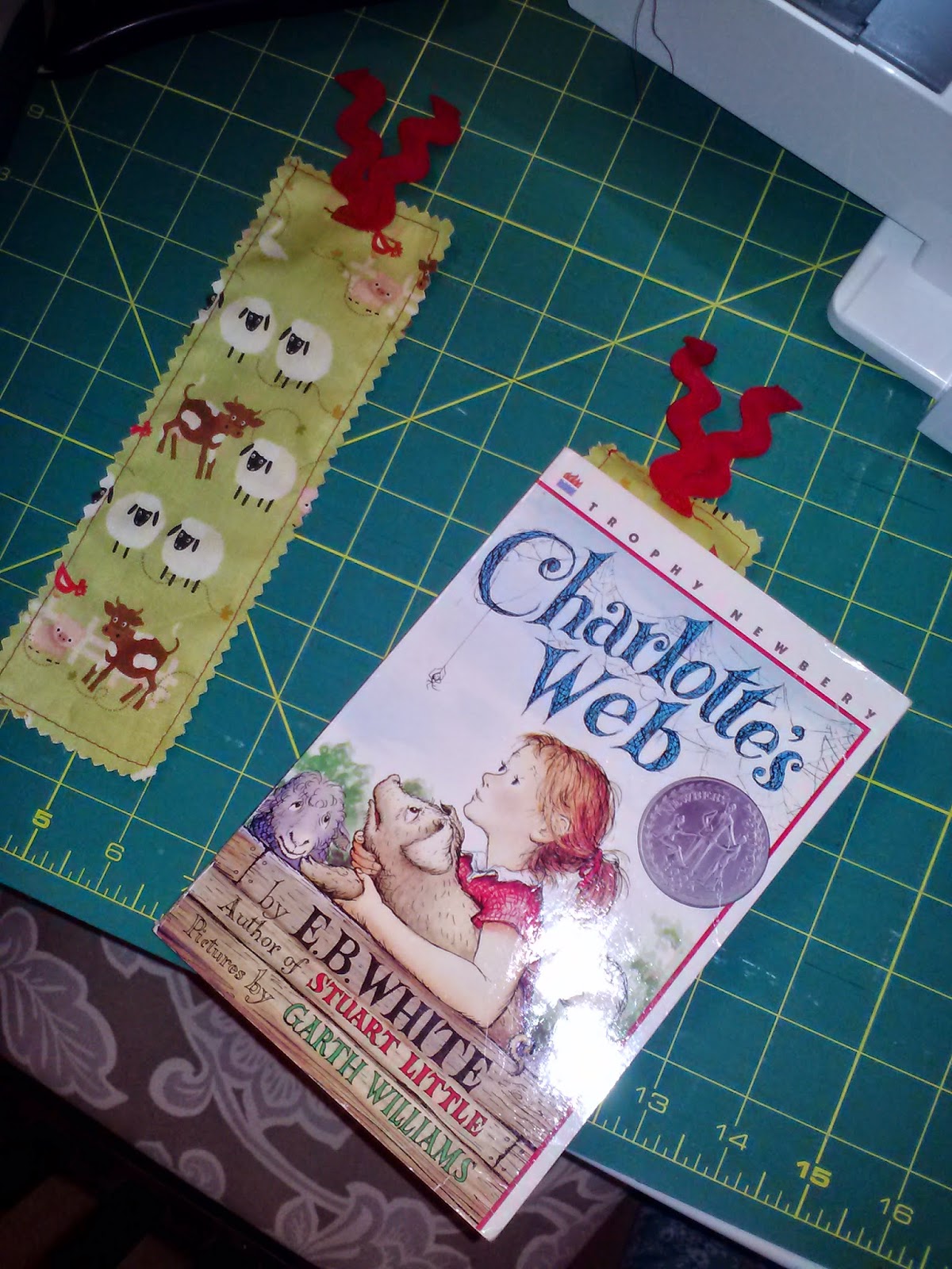 I wanted to send a little thank you to some friends for letting us visit their farm. I had some of this cute farm animal fabric leftover from my bookshelf quilt, so I made a few bookmarks.